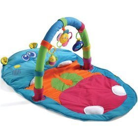features fun sounds and colorful characters on a soft play mat;Plush play mat and activity bar entertains through sight, touch and sound