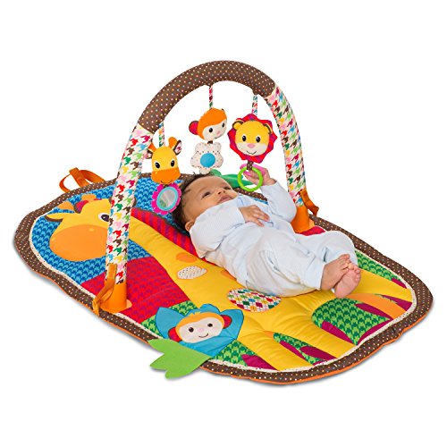Age grade 0 Months Plus;3 Swinging Toys: Giraffe Mirror, Monkey Rattle, Crinkle Lion;Folds-up compactly;Helpful handle for storage;Vibrant mat with fun peek n' see flaps