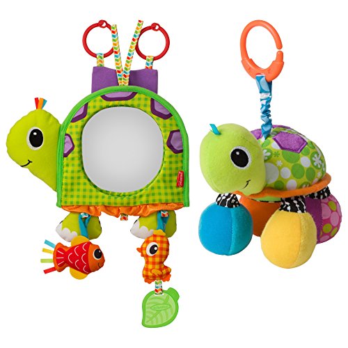 Large domed travel mirror allows greater visibility inside car;Fun dangling characters bounce with car's motion and are removable for extended play;Attachment straps and easel-back extend mirror use to cribs and floor play;Bright colors, fun textures, peek a boo mirror and rattling, crinkling feet engage baby's senses;Easily links to car seats, strollers and diaper bags