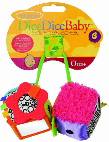 ふたつの六面体それぞれの面に異なる質感のファブリックやミラーを配し、ひとつひとつの面を見るたび、触れるたびに赤ちゃんの好奇心を刺激します。ポケットにはビビッドなカラーの歯がため。さらに、手でゆすると音の出る仕掛けが!ベルトにマジックテープが付いているので、ベビーベッドやベビーカーにぶら下げることも可能です。