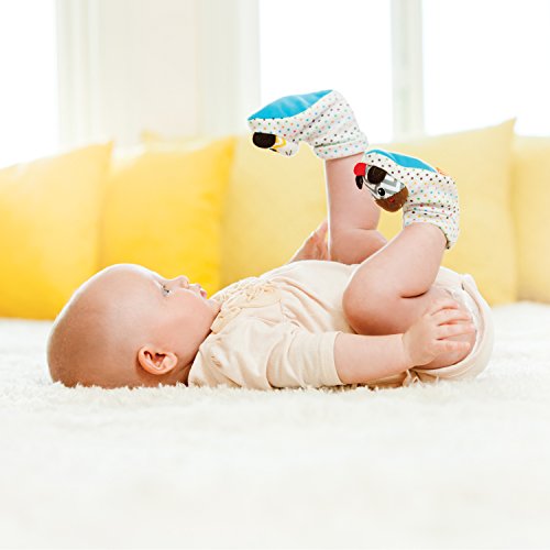 Slip on with ease;Whimsical characters keep baby entertained;Rattle inside each fun plush friend