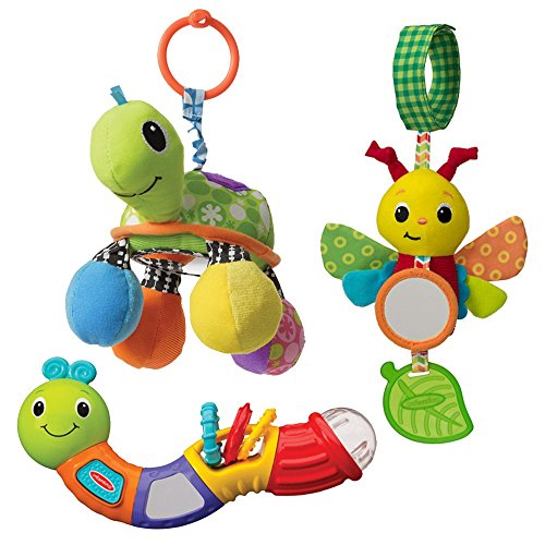 Move and Soothe Chime Pal's gentle chime sound encourages baby to reach, bat and shake. Includes signature tether leaf;Shake, twist, spin and play the Twist & Play Caterpillar Rattle;Turtle Mirror Pal features bright colors, fun textures, peek a boo mirror, and rattling. Crinkling feet engage baby's senses;Easily attach the Chime Pal and Turtle Pal to any car seat or stroller;Chime Pal and Turtle Pal for 0+ month baby. Caterpillar Rattle for 6+ months