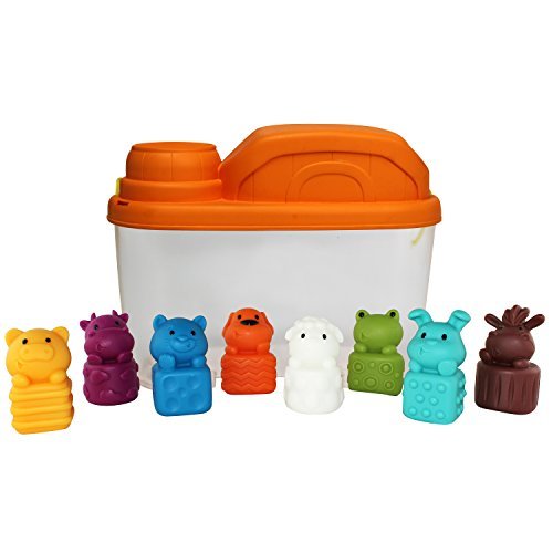 These squeezable, teethable farm animals each feature a different texture to explore, perfect for encouraging tactile and sensory development in little ones. Use these fun critters to introduce colors, animals and shapes. Sort each animal through the barn roof shape slots, according to their base shape. The sort n' store barn doubles as a hand storage bin when playtime is done.