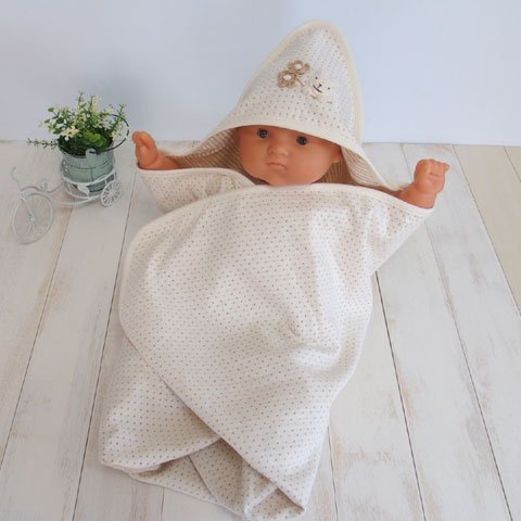 - うさぎの手編みモチーフのアフガン。赤ちゃんをくるんであげる時、画像のようなフードがございます。