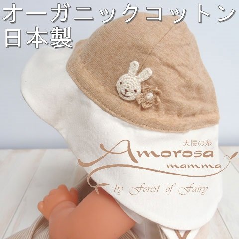 日本製 オーガニックコットン 編みモチーフ付き日よけ帽子!ウサギ アモローサマンマ Amorosa mamma!