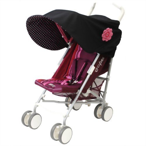 シックなブラック&キュートな柄のリバーシブルに加え、カワイイアクセサリ(デコクリップ)も付いているデザインベビーカーサンシェード