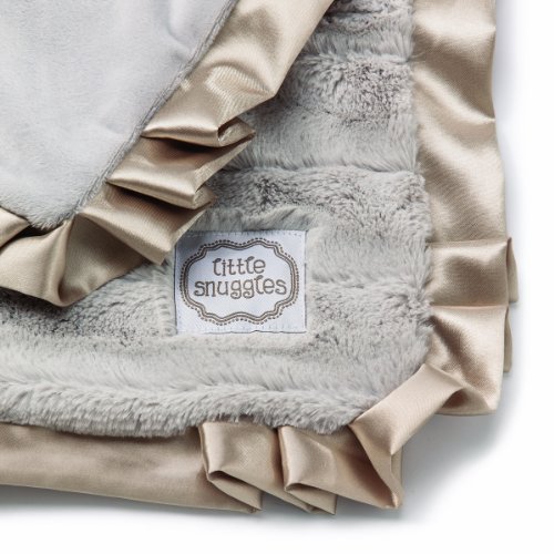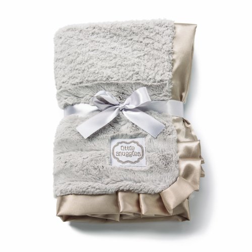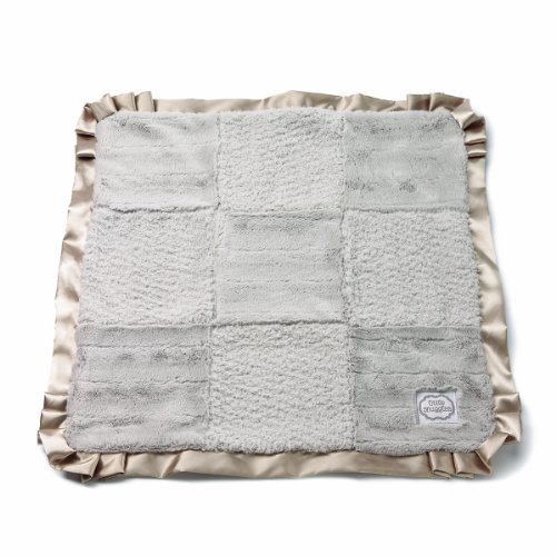 Text on the blanket reads: little snuggles;Ultra-soft textured fabrics in a patchwork design;Silky satin trim;Tied with a satin ribbon, ready for gift giving;Blanket measures 24 x 24