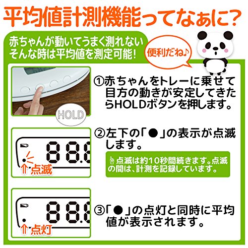 - 視認しやすいデジタルディスプレイと大きめのボタンで簡単操作!日々成長する体重を5g単位で正確に計測する高性能なスケールです。毎日のコンディションを管理できます。平均値測定を使用すれば、じっとしていない赤ちゃんでも10秒間点滅計測し平均値を自動計算します。風袋引き機能でバスタオルやトレイなどの重量をあらかじめ計測し、正確な体重を導き出します。高性能・高詳細にこだわったハイスペックスケールです。たっちが上手にできるようになったらトレイを外してパンダ体重計に変身♪30kgまで計測可能。