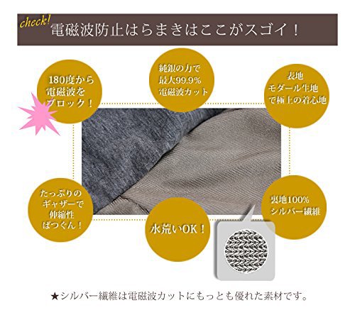 - 表地には柔らかく肌ざわりが良いモダール(天然素材)を使用。裏地にはシルバー繊維100%使用!シルバー繊維は電磁波カットに最も優れた素材です。たっぷりギャザーで伸縮性抜群!産前~産後まで長く着用していただけます。つわりなど締めつけが不快な妊婦さんにもおすすめ。お腹の冷え防止もできます。電磁波カットエプロンは場所を選びますが、電磁波防止はらまきならアウターを気にせずオールシーズン着用できるのでいつでもどこでも安心を得られます。