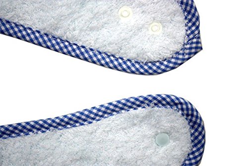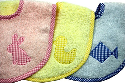 汗や水分を素早く吸収し、汗をぬぐってもべとつかない、お肌にもやさしいのが特徴です。今治タオル産地では品質を確実に保証するため、四国タオル工業組合が定める品質基準で認められたブランドマークが付いています。今治タオルを使ったスタイです!ギンガムチェック柄のパイピングにうさぎ、あひる、お魚のアップリケ付きです。安心の日本製、ベビーにも優しいので、出産祝いやギフトなどにも最適です!