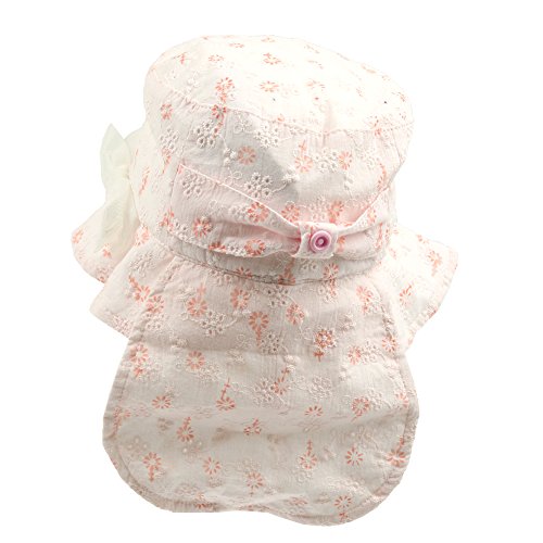 夏には欠かせない日除け付のハットは日除け部分を折りたたむとリボンの飾りになります!プランサーのボタンなので簡単取り外し☆お花柄のレース素材なので、柔らかく持ち運びもラクラクです!つばも広く日差しもしっかりガード。UVカット加工がされています。サイドのシフォンリボンもかわいいです♪♪