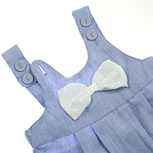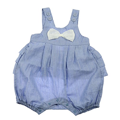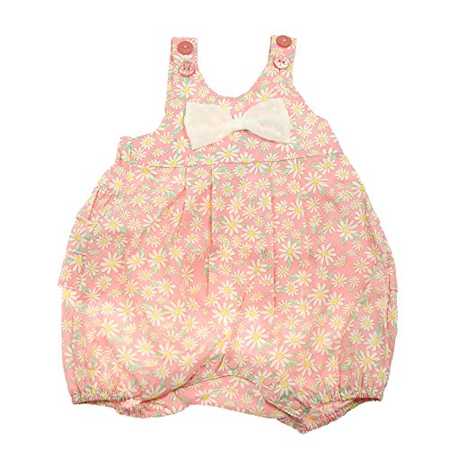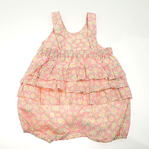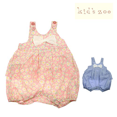 バックスタイルがとてもかわいいふんわりシルエットのフリルオール・サロペット。ピンクはマーガレット柄の薄手の柔らかいブロード、ブルーは薄手の無地のダンガリー素材です。リボンはドットのシフォン素材です。肩ひもはボタンで長さ調節ができます。どちらも春から夏頃までお使い頂けます。