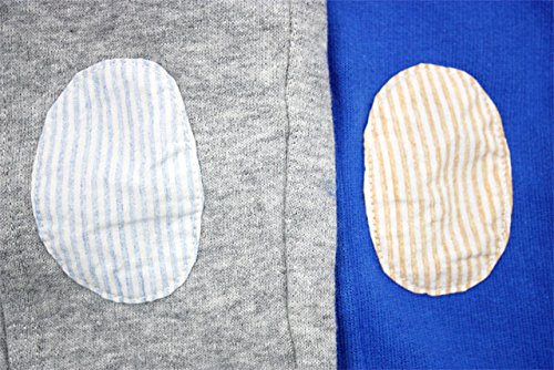 ストライプ柄の膝当てのニーパッチ付きです。ベビーでも履きやすい裾リブタイプです。合わせやすいグレーと冬の暗くなりがちなコーディネートの差色にもなりそうなブルーの2色です。