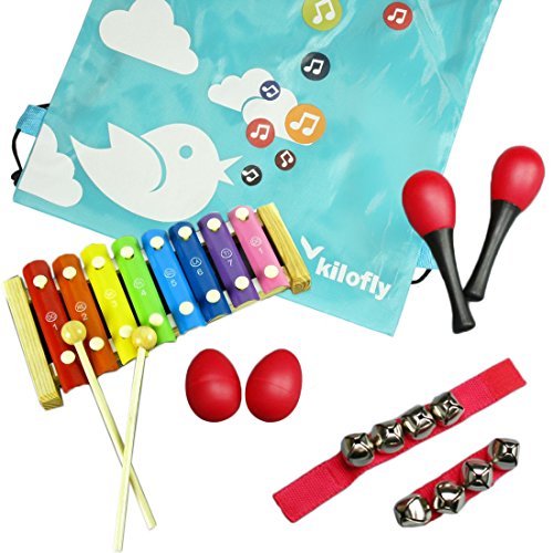 キロフライミニバンドの楽器のバリューパックは虹のように美しい8個音色の木琴1つを含みます。音と美しいを追加するためには、リズムおもちゃの6つは、2つのプラスチックマラカス、卵シェーカー2つと2つの手首の鐘。セットは便利なポーチで詰まっています。