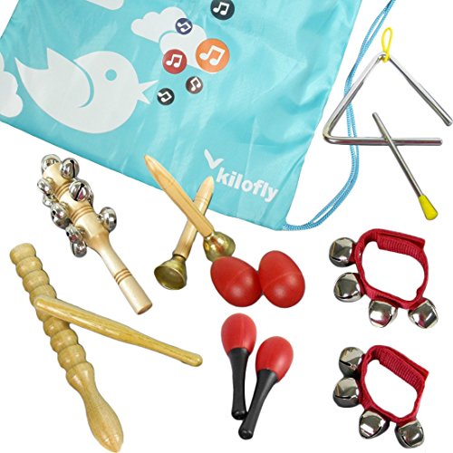 キロフライミニバンドの楽器のリズムおもちゃバリューパックは1つのトライアングル、手の鐘2つ、木の振動・ベル1つ(13ベルを含む)、1つの木製のギロ、赤マラカス2つ、赤卵シェーパー2つと赤のレッドリストの鐘2つを含めます。セットは便利なポーチで詰まっています。