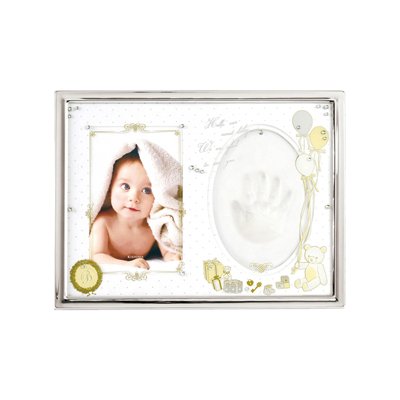 - 赤ちゃんの手型と大切な写真を一緒に飾ることができます。ガラスにプリントされたイラストとキラキラ光るラインストーンが優しく上品な雰囲気の卓上用手型フォトフレームです。