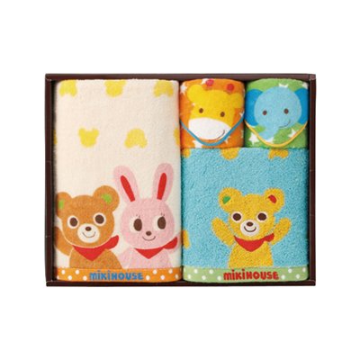 - フェイスタオル×1(750×340mm)、ハンドタオル×1(350×340mm)、ミニタオル×2(200×200mm)(材:綿100%)