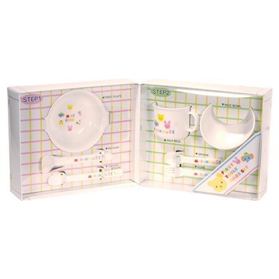 - ファーストプレート×1、ミルクマグ×1、ライスボウル×1、マッシャー×1、フィーディングスプーン×1、スプーン×1、フォーク×1(材:ポリプロピレン)
