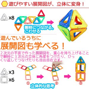 - 遊びながら知力アップ。 全世界で人気のある立体パズル知育玩具として、より魅力的で子供に愛されているマグネットブロッグです。簡単に平面図形を作れ、幾何学的な3次元構造を簡単に構成できる立体パズルので、設計能力・創造力・空間視覚能力などの能力の育成に役立ちます。基本の立体パズル組み方や取扱説明書に掲載している作品を参考にしながら自由に発想でお子様のつくりたい作品を考えさせます!