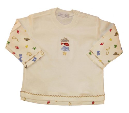 Kissy Kissyベビー服ソフトコットンKissy Kissy幼児オフホワイトの長袖シャツと刺繍されたカウボーイギアの前面とカウボーイプリントが施され、正面の袖になっています。