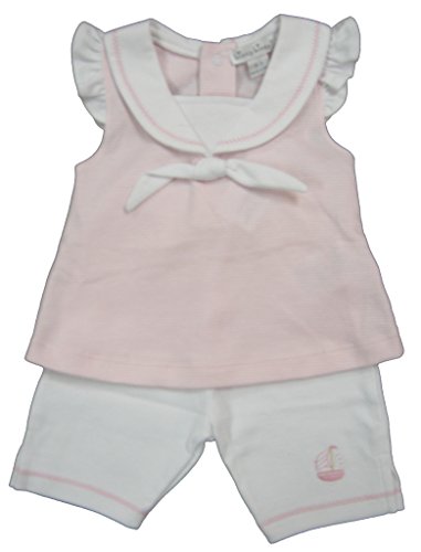 Kissy Kissy女の赤ちゃん服柔らかいコットンKissy Kissy幼児カプリパンツセット」を参照してください。トップはホワイトとピンクのストライプ、セーラーの襟。下部はホワイトピンク色の刺繍でヨットです。