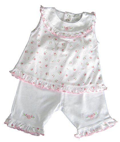 Kissy Kissy女の赤ちゃん服柔らかいコットンKissy Kissy幼児ホワイトとピンクのパンツセット。ローズプリントで、トップはノースリーブのシャツに、白の襟と刺繍されたピンクのバラ。パンツはカプリス、ホワイトピンクローズ刺繍付き。