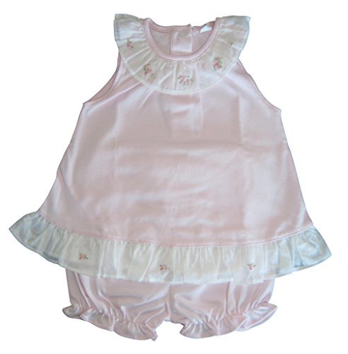Kissy Kissy女の赤ちゃん服柔らかいコットンKissy Kissy幼児ピンクサンスーツ。トップはピンクで刺繍された花にホワイトフリルを襟と裾。ブルマは、一致するピンク。