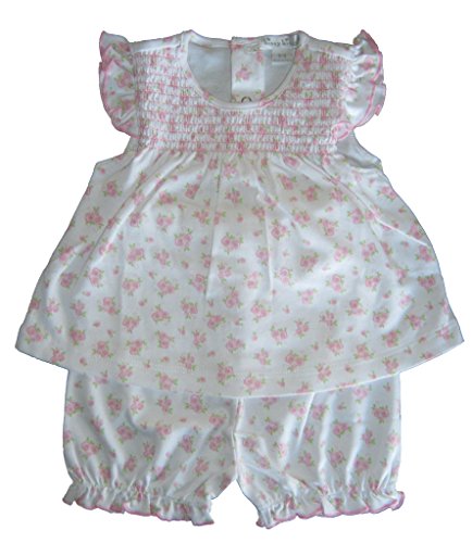 Kissy Kissy女の赤ちゃん服柔らかいコットンKissy Kissy幼児ホワイトスーツカバーされたピンクの花の印刷された文書でスモックに大きく前面に。