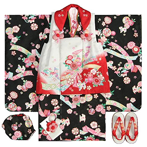 七五三 着物 3歳女の子被布セット 京都花ひめ 黒地着物 被布白赤切替 二段重ね衿 刺繍半衿に足袋付きフルセット