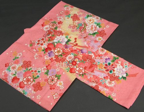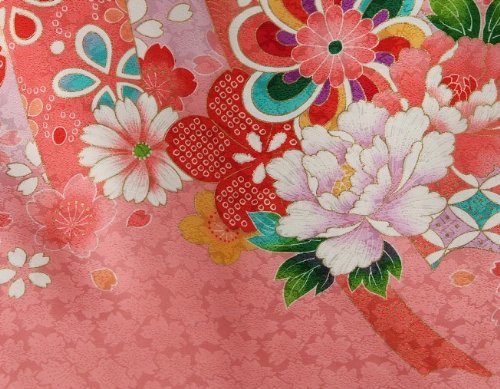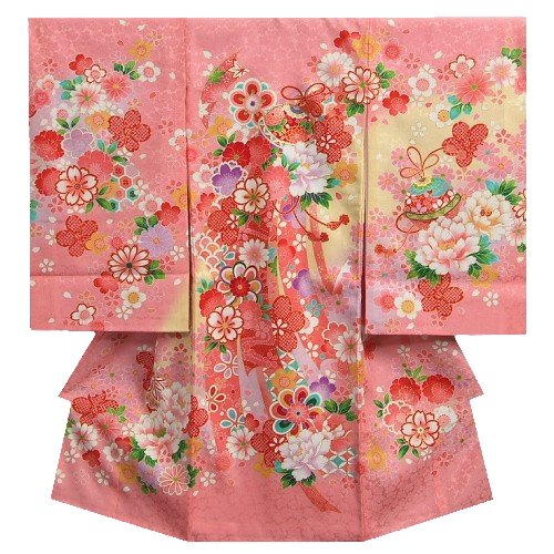 - 落ち着いた高級感があるピンク色地の女の子のお宮参り着物です。柄は古典柄ですが様々な華々で賑やかな印象を受けます。