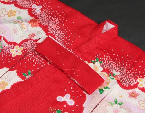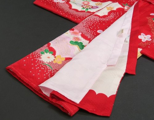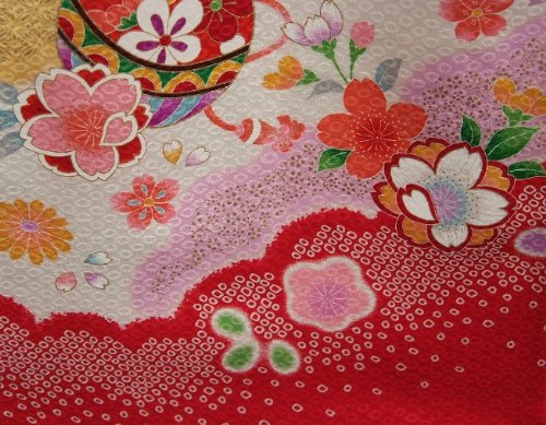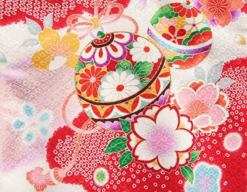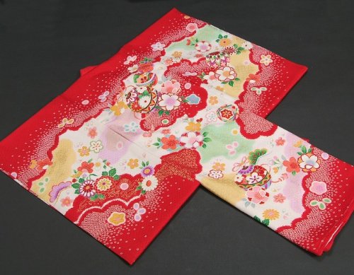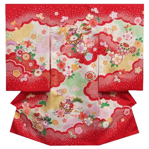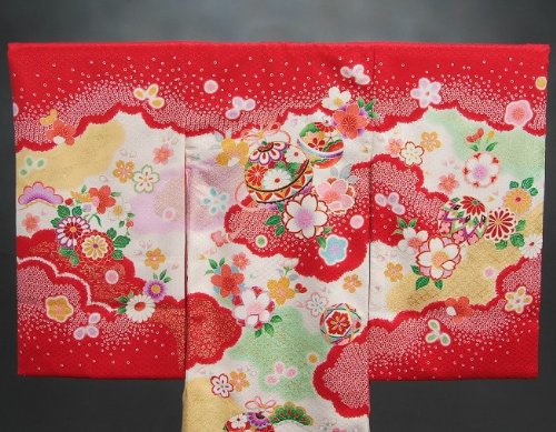 お宮参り着物 女の子正絹初着 赤 桜 まり 金コマ刺繍 疋田柄 日本製
