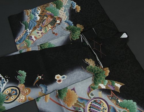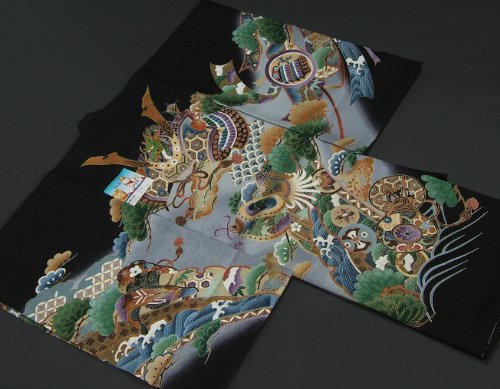 兜をメインに縁起柄の代表格の松竹梅など様々な縁起物が描かれております。生地全体にまだら地紋も入っており見た目にも高級感があります。