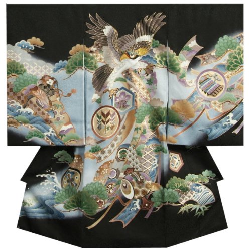 - 黒地を基調に松竹梅や鷹などの縁起柄が施された男の子のお宮参り御着物です。