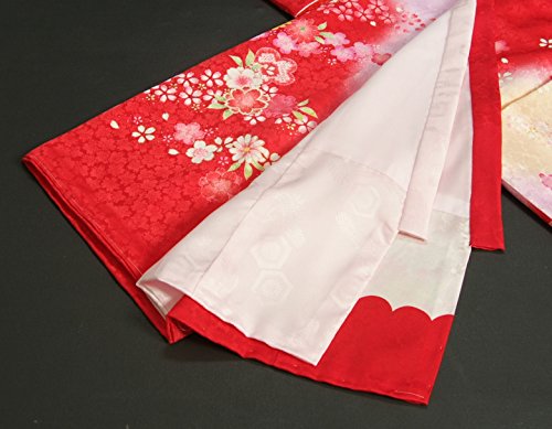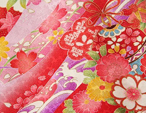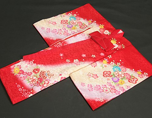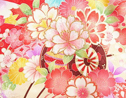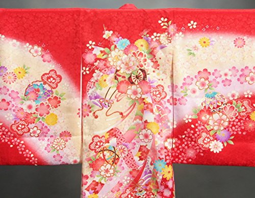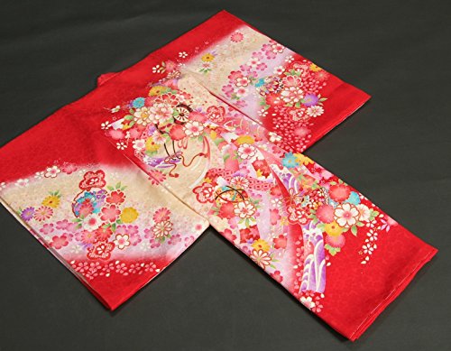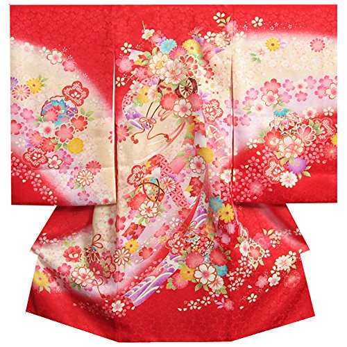 - 赤色の御着物をベースにベージュのぼかしが入った女の子のお宮参り御着物です。柄は桜や花車など様々な縁起柄が御着物全体を彩ります。
