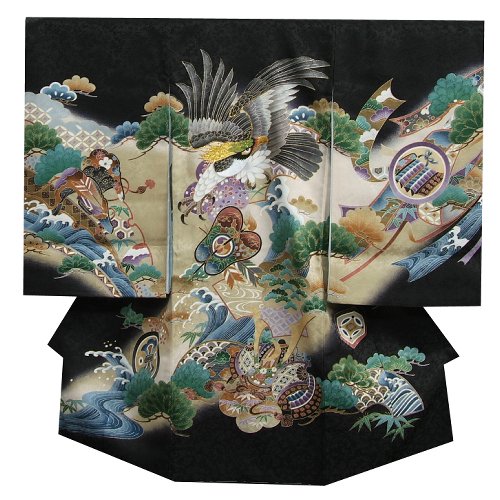 お宮参り着物 正絹男児初着 黒 ベージュ 刺繍鷹 松竹梅 兜