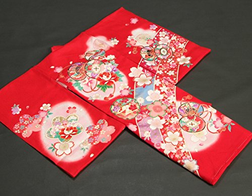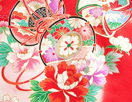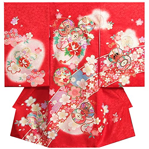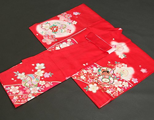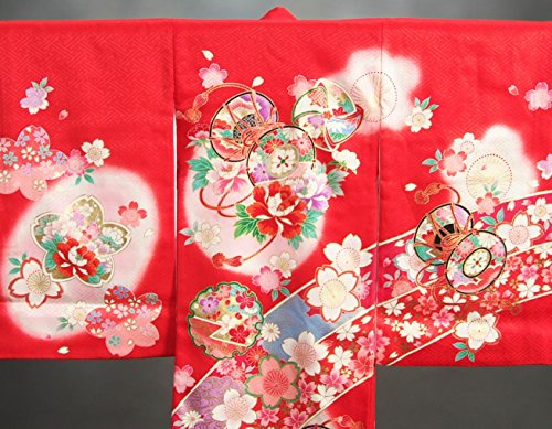 - 赤を基調としたお宮参りの女の子の正絹の初着です。大き目の柄使いに鼓や桜、雪輪などの古典柄が存在感があります。