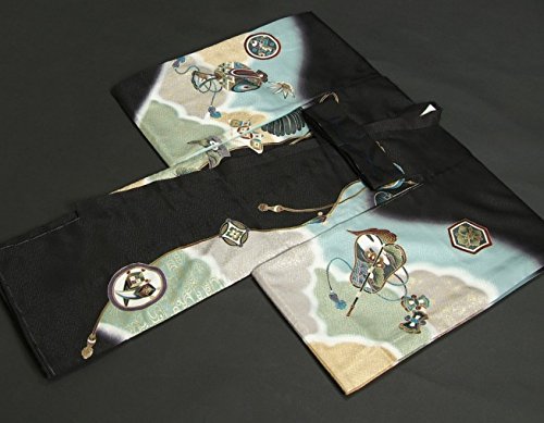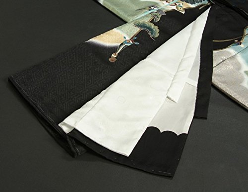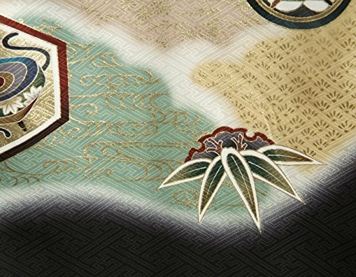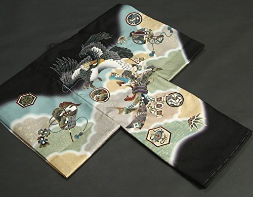 - 黒を基調に金茶、グレー、濃水色などの高級感ある四色染めになり柄は鷹や束ね熨斗を中心に軍配や紋柄などの縁起柄が御着物全体を彩ります。