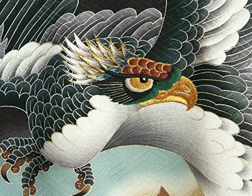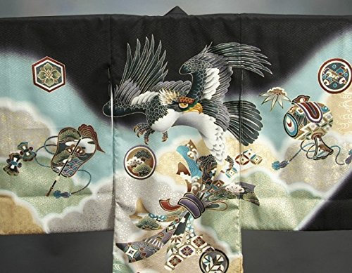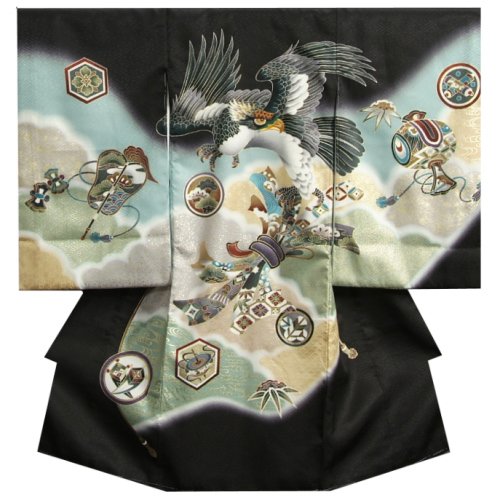 - 鷹の頭部分に刺繍を使用した男の子の御着物です。色目は黒地で柄域はベーシックな古典柄になり、鷹の頭部分に使用した刺繍を引き立たせます。