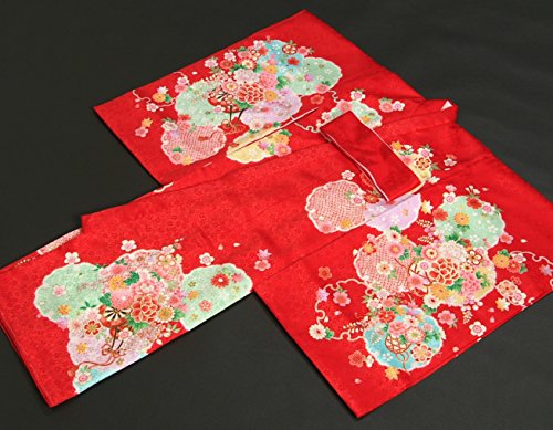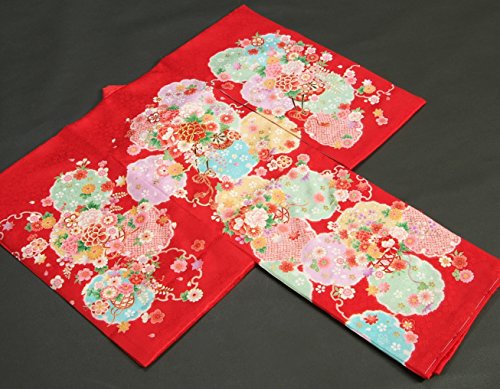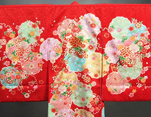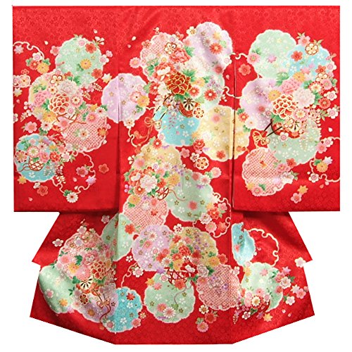 - 赤地色を基調とした古典柄の女の子のお宮参り着物です。赤をベースに紫、水色、黄色、黄緑の四色の雪輪染めを配色した落ち着いた雰囲気の中に華やかさを表現した御着物になります。