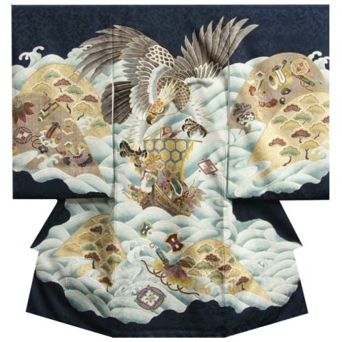 お宮参り 着物 男 正絹初着 紺 荒波飛翔鷹 宝船 金糸刺繍使い 金銀彩 まだら地紋