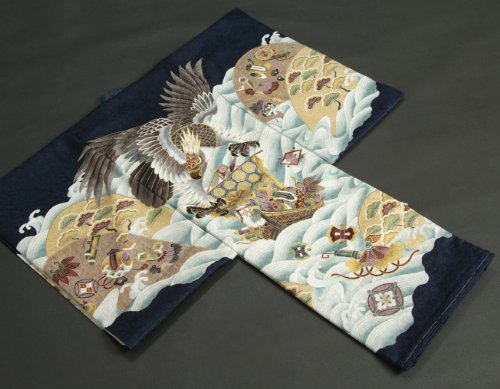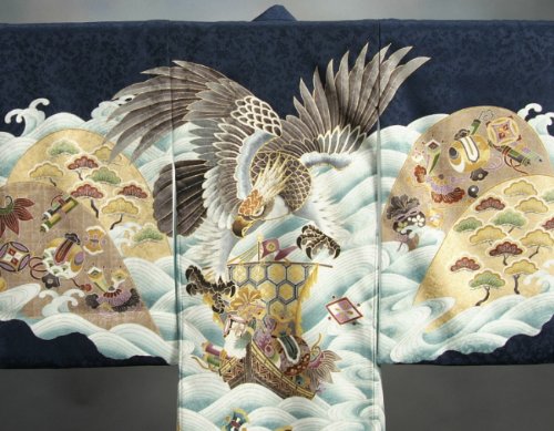 - 荒波を飛翔する鷹が配色されたインパクトのある紺地色の男の子お宮参り着物です。