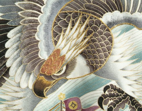 - 柄には鷹のほかに宝船、小槌、松、紋柄など様々な縁起柄が御着物を彩り、メインの鷹の頭部分には金糸刺繍が使用してあり豪華さもあります。