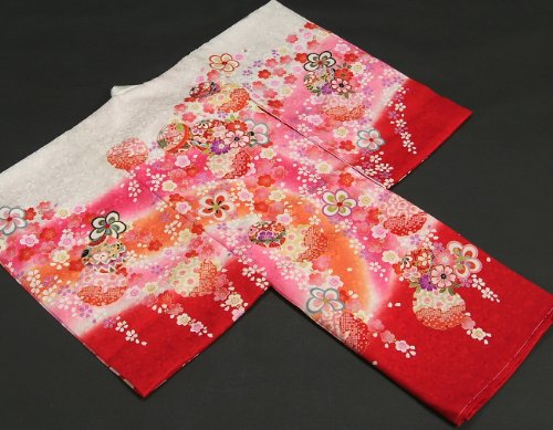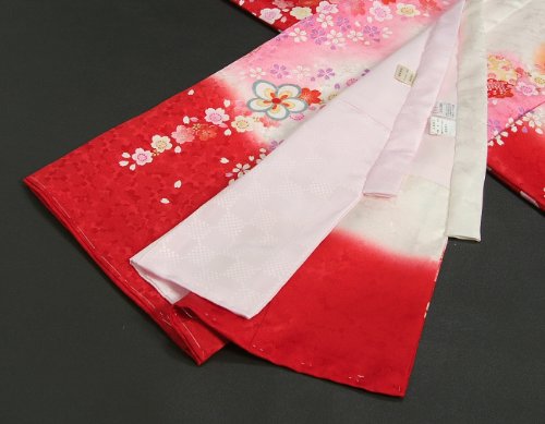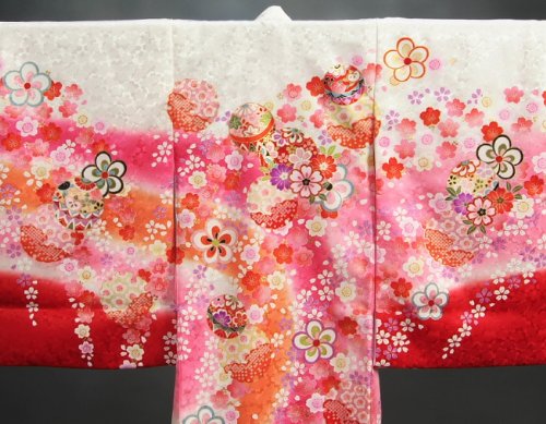 白地に裾赤染め分けとピンクぼかしなどを配した正絹の女の子お宮参り初着です。