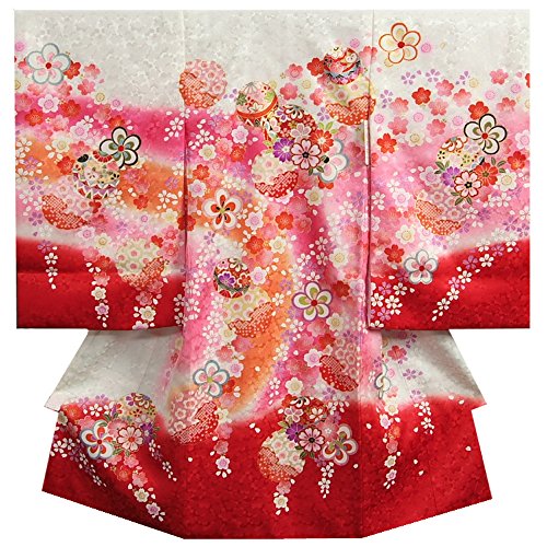 お宮参り 着物 女の子 正絹初着 白 裾赤染め分けグラデーション 桜 まり 金コマ刺繍 桜地紋 桜尽くし 日本製