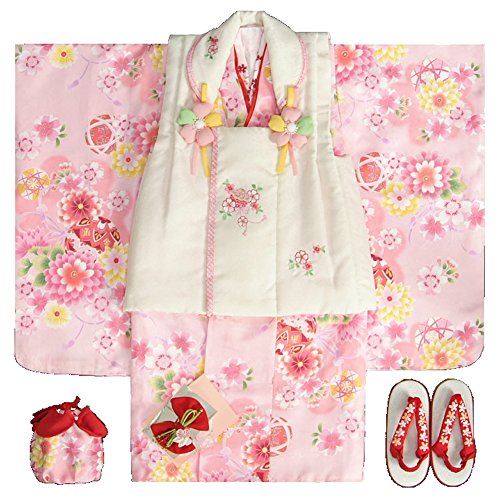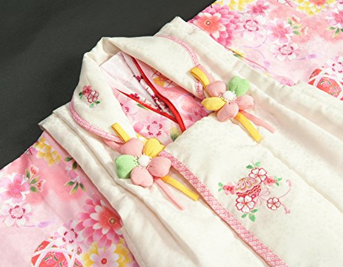 - かわいらしいピンク地の着物にベージュに近いオフホワイトカラーの七五三着物3歳被布セットです。