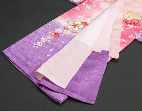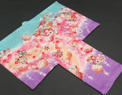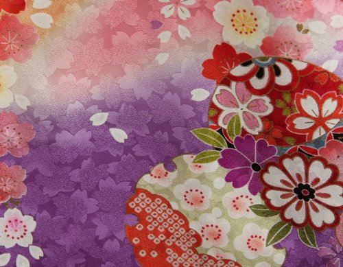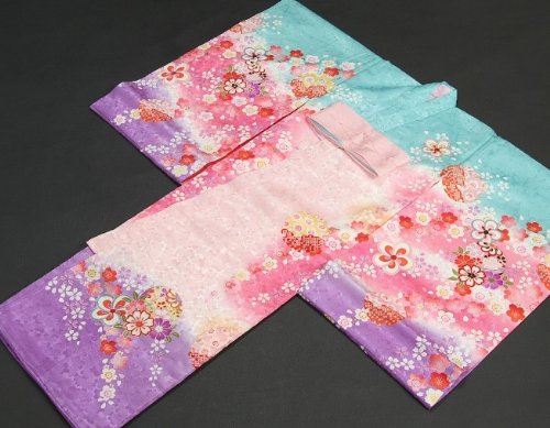 - 青紫に濃淡ピンクのグラデが非常に珍しい色合いです。柄には桜、地紋も桜の桜尽くし仕様になっています。