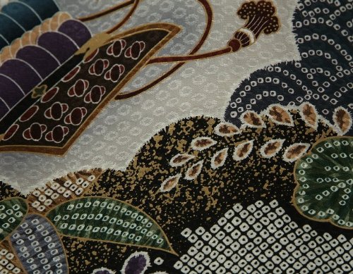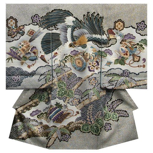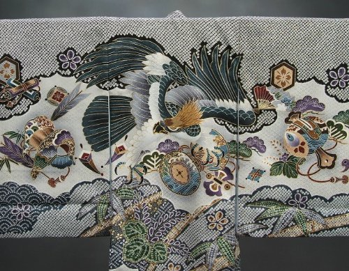 - 黒地の総疋田柄が見た目にも豪華な男の子のお宮参り御着物です。メイン柄の鷹の頭部分に金糸刺繍が入って高級感もあります。全体に入った疋田柄と刺繍が合わさり御祝着にピッタリな非常に賑やかな柄域になります。
