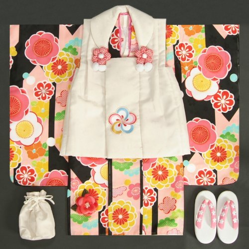 七五三着物3歳 女の子被布セット 小町kids(小町キッズ)ブランド 黒色 被布オフホワイト 刺繍使い 矢絣柄 刺繍半衿に足袋付きフルセット