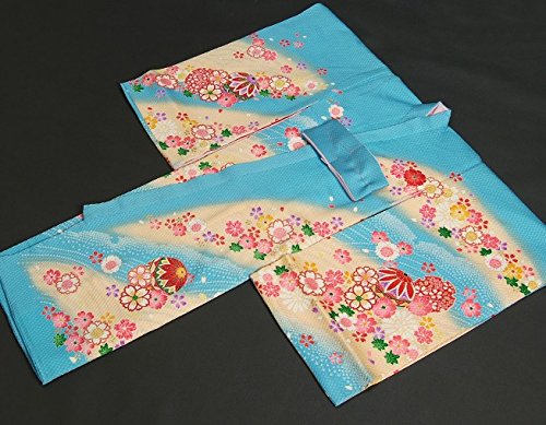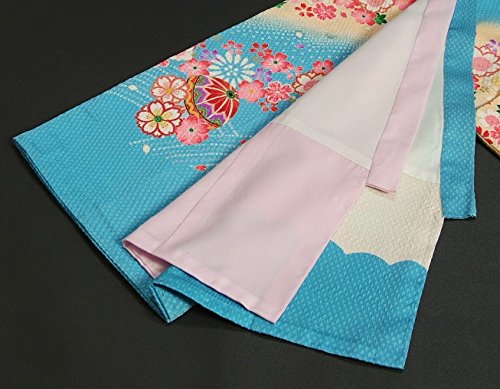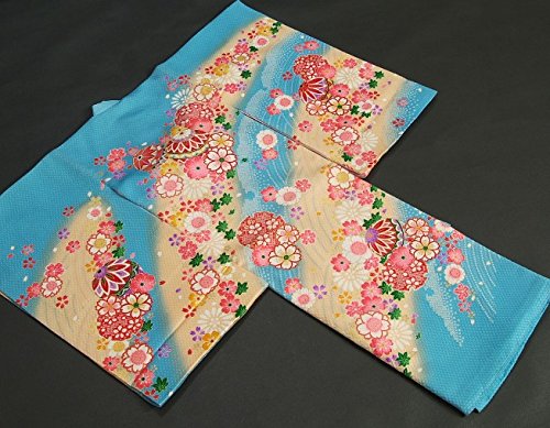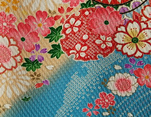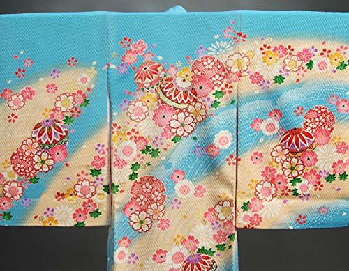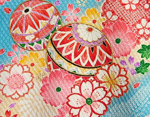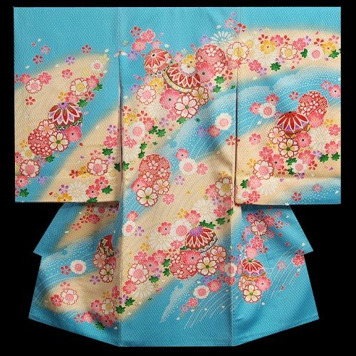 - 柄のまりの輪郭には金糸刺繍がほどこしてあり豪華な御着物です。色目は水色を基調に染められていますので非常に個性的な御着物になります。