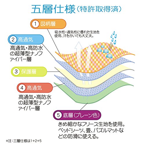 - 長所:高防水性(一晩中安心)、高耐久性(洗濯や日焼けに強い)、高通気性(通気 性・防水性に優れたナノファイバーを使用)、高吸水性(図柄層)、高防滑性(プレー ン色層はベッドシーツ、パズルマット、畳などの防滑に使える)、赤ちゃんのオムツ替 えにも(持ち運びに便利)